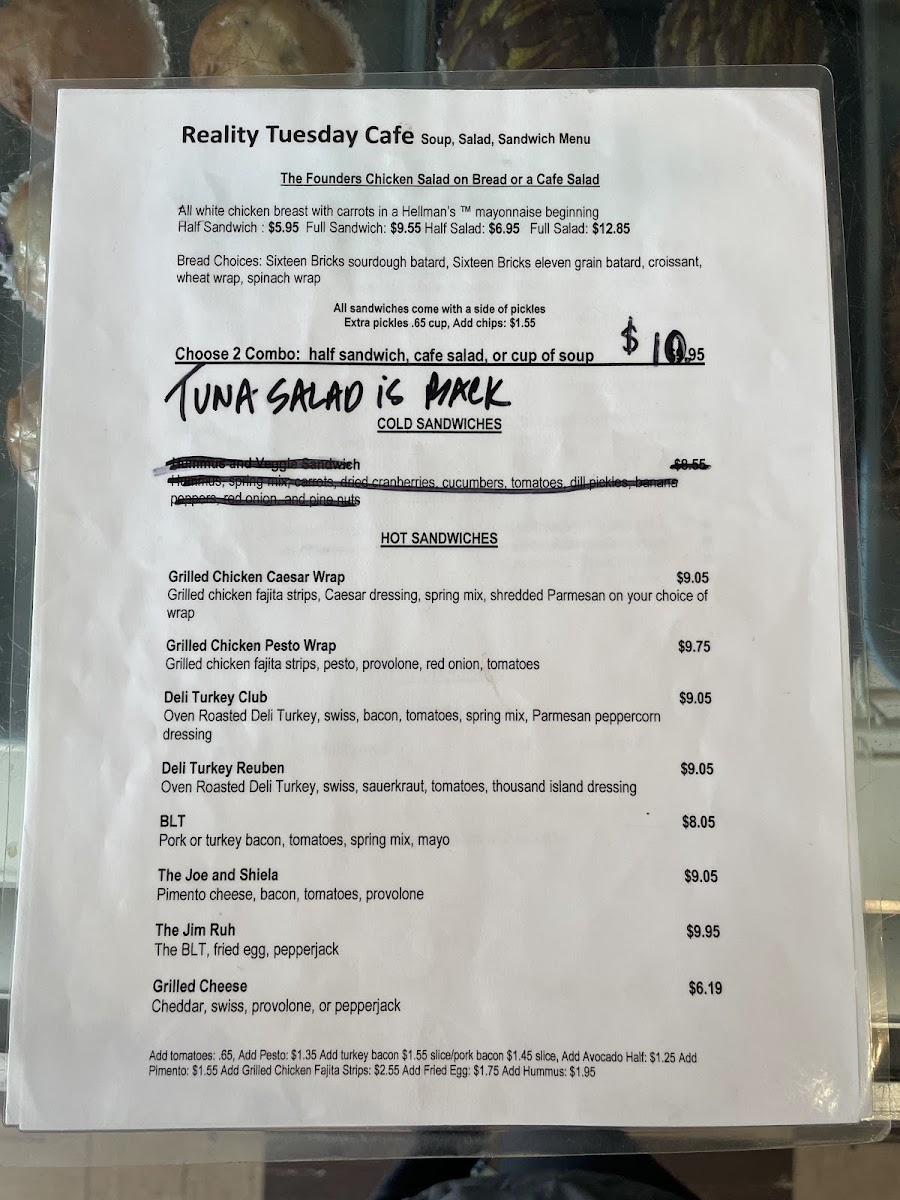 hummus, shredded carrots, dried cranberries, pine nuts, organic mixed greens, cucumbers, home grown tomatoes, alfalfa sprouts, dill pickles, and red onion. add cheese for 0.59 cents a slice